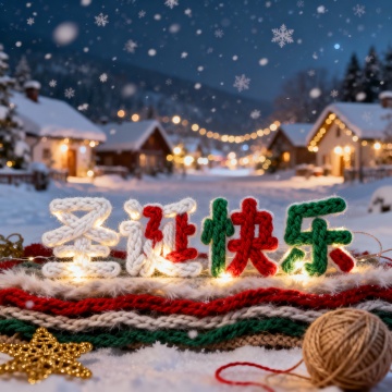 毛线编织的“圣诞快乐”在雪夜中温暖发光,融合重拟物风与面料质感,光影交织,营造喜庆温馨梦幻的节日实景。