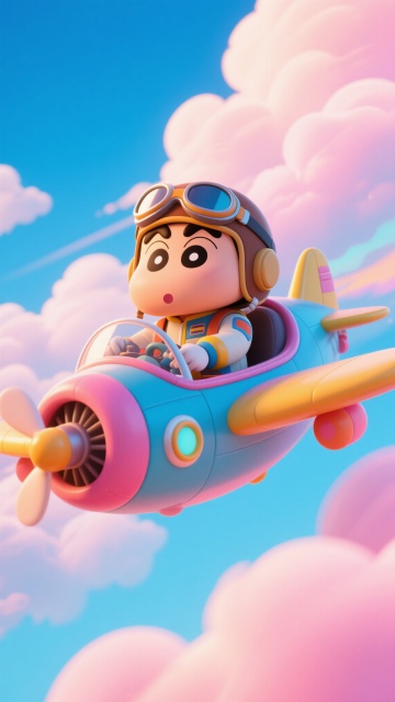 3D风格,蜡笔小新飞行员,穿着飞行服,戴着飞行帽和护目镜,坐在可爱的飞机驾驶舱内,飞机造型圆润可爱,色彩鲜艳,在粉蓝渐变的云海中翱翔,背景是明亮的蓝天,卡通风格3D,整体画面非常丰富多彩和美丽