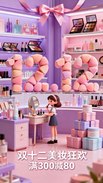 软3D风格微缩艺术场景,粉嫩色调营造甜蜜可爱氛围,卡通少女化妆造型呼应双十二美妆主题,膨胀感数字“12.12”点缀其间,充满节日狂欢气息。