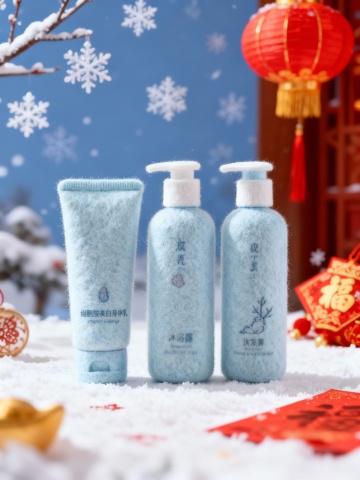 将图示商品变成毛毡质感,瓶身有精致文字与图案,还原商品颜色细节。冬日新年场景