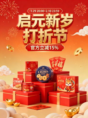 国潮卡通风新年商品海报,以叼金麦克风的 Q 版白骏马为视觉核心,鬃毛飘红金飘带、饰烫金福字与卷草纹,红金声波搭配金粉烟花环绕。四周错落陈列数码、美妆、零食等多元年货,均带新年红金包装。背景以正红为底,叠加祥云、灯笼、剪纸、鞭炮等喜庆元素。中心构图,商品分层环绕,色彩红金为主、亮色点缀,文字突出 “新年好物马上开麦” 主题与促销信息,年味浓郁且卖点鲜明。