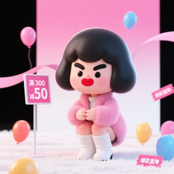 软3D风格卡通女孩,毛绒质感外套搭配俏皮表情,粉色系场景营造可爱氛围,结合促销标语与气球元素,传递节日促销感。