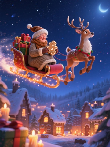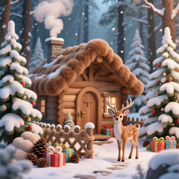 场景: 雪森林村庄里温馨的圣诞场景,小木屋窗户透出温暖灯光。