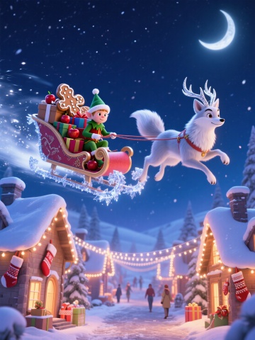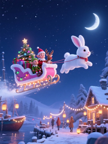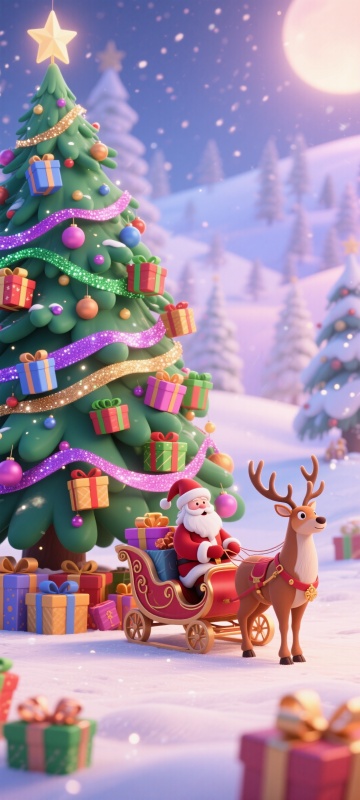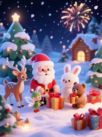 梦幻感与温馨感交织的圣诞夜,卡通风格插画风呈现。孩子们与拟人化的小兔、鹿围聚在闪耀的圣诞树下,水彩质感渲染雪景,营造出童话般的节日氛围。