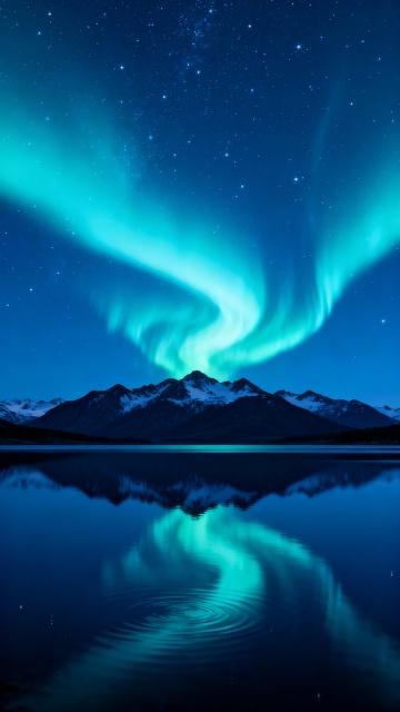 夜晚的北极景观,深蓝色渐变天空中悬挂着一轮巨大明亮的满月,柔和的月光洒在覆盖着皑皑白雪的连绵山脉上,山脉轮廓清晰可见,山脚下是平静如镜的冰蓝色水面,完美倒映着天空、月亮和山脉的景象,水面上有轻微的涟漪,远处天空中点缀着几颗稀疏的星星,整体画面呈现出超现实的宁静、清冷而壮丽的氛围,具有高度细节的3D渲染质感,色彩以深蓝、冰蓝和白色为主,光影对比柔和,构图采用对称平衡的布局,给人一种开阔悠远的视觉感受。