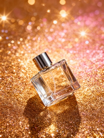 复古圣诞树背景,鎏金与红绒蝴蝶结点缀,轻拟物风香氛瓶悬挂其间,金属质感瓶盖呼应奢华感,暖光环绕,营造喜庆温馨氛围。