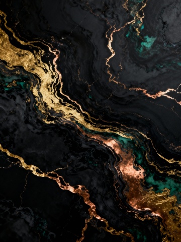 流体艺术风格的抽象背景,以深蓝、靛蓝、翠绿、橙色和紫色为主色调,呈现出流动的漩涡状纹理和丰富的色彩渐变,点缀着金色闪光颗粒和大小不一的橙色圆形斑点,整体具有浓厚的油画质感和颜料交融的流动性,色彩过渡自然柔和,光影效果深邃神秘,营造出宇宙星云般的梦幻氛围,变换为带有细腻磨砂光泽的金属质感,同时保留原有的色彩搭配、漩涡形态和金色闪光元素,使画面呈现出光滑而略带颗粒感的金属表面效果,色彩在金属质感下更显饱和且带有微弱的反光。