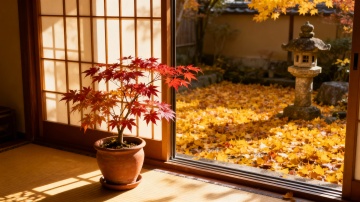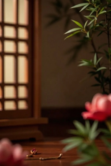 竖构图,宋代水墨风格工笔重彩,深秋的江南古刹后院,画面中央是半月形的青石板浅滩,倒映着斜斜掠过的丹枫枝桠,形成破碎却灵动的对称。前景是青苔斑驳的青灰色石阶,不规则的积水洼中沉着几片朱砂色枫叶,边缘泛着冷银色的反光。背景是几株千年银杏,金黄扇形叶片在黛色瓦檐间簌簌飘落,晨雾带着淡青色从飞檐斗拱间漫出,与初升朝阳的暖金交织成缥缈的光幕。左侧一株老梅虬曲的枝干斜插入画,墨色枝干上已缀着几点含苞待放的胭脂红。整体色调以靛青、赭石、泥金为主,笔触既有工笔的细腻勾勒,又有水墨的氤氲晕染,宣纸纹理间透出古旧的绢黄色,垂直的银杏树干与水平的浅滩倒影形成禅意的几何对比,营造出"空山新雨后,天气晚来秋"的空灵意境。
