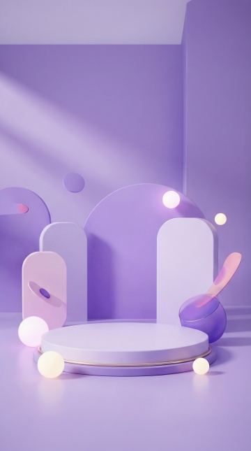 3D渲染风格的展台场景,画面中央有一个圆形的白色展台,展台周围环绕着大量蓬松、柔软的淡紫色云朵,云朵呈现出棉花糖般的质感,边缘柔和,带有细腻的纹理。背景是渐变的深蓝色天空,点缀着几缕轻薄的白色云彩,光线从云层间隙洒落,形成柔和的光束,照亮展台顶部,营造出梦幻、宁静且略带神秘感的氛围。整个场景色彩和谐,以紫色和蓝色为主色调,光影过渡自然,构图采用对称美学,展台位于画面中心,成为视觉焦点,周围的云朵和天空元素围绕展台展开,形成平衡的视觉引导线,整体画面干净整洁,空间感强。