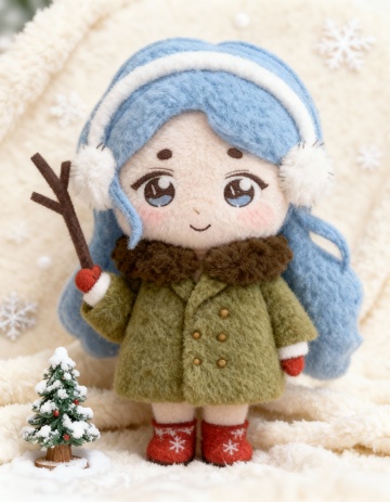 软3D风毛绒娃娃,蓝发戴耳罩,穿绿大衣持树枝,旁有雪松,暖色系布料质感,梦幻温馨圣诞氛围。