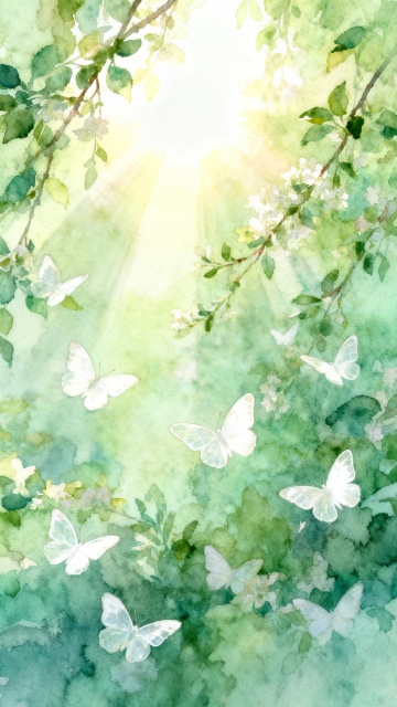 水彩插画风,清新梦幻的春日景象,绿意盎然,花影婆娑。