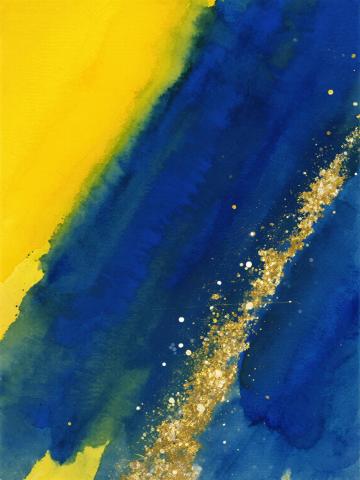 深蓝色调的水彩风格背景,流动的金色光带如同彗星尾迹划过画面,无数细碎的金色与蓝色光斑在深邃的蓝色空间中悬浮闪烁,呈现出梦幻而柔和的晕染效果,整体画面充满流动感和轻盈的透明质感,色彩层次丰富,光影交织营造出宁静而璀璨的宇宙氛围。