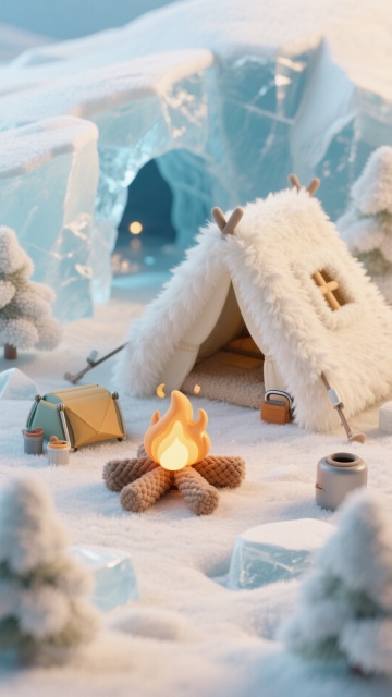 毛线编织的冬日露营场景,拟人化小人围坐篝火烤棉花糖,温暖治愈。微缩艺术风搭配卡通感设计,展现温馨可爱的节日氛围。