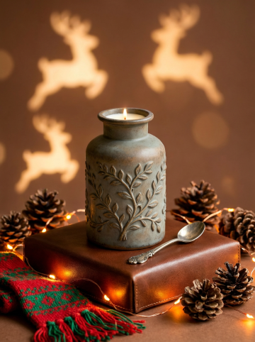 复古质感陶瓷烛台,浮雕枝叶纹饰,搭配皮影鹿影光影,金属勺与松果点缀,营造温馨质朴的圣诞文艺氛围。