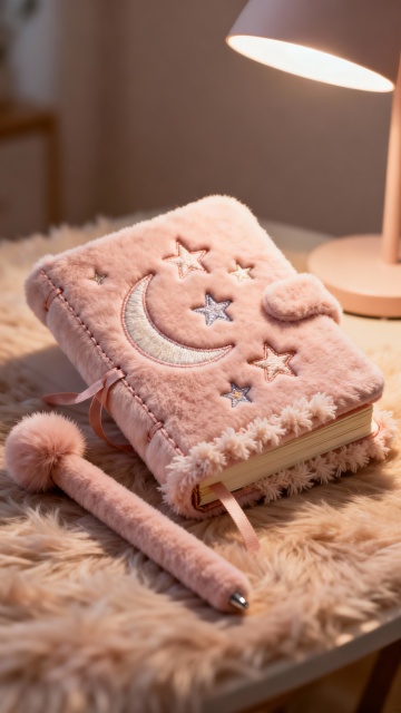 粉嫩毛绒手账本,刺绣月星图案,搭配毛球笔,柔和灯光下尽显甜美可爱与温馨舒适感。
