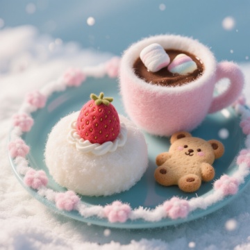 软3D毛绒质感甜点,梦幻粉色系搭配可爱小熊饼干与草莓奶油蛋糕,营造温馨冬日甜蜜氛围。