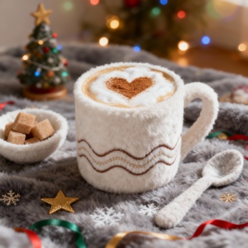 毛绒质感的圣诞主题咖啡杯,搭配心形拉花与温暖灯光,营造出温馨、舒适、甜蜜的节日氛围,融合轻拟物与实景感设计,尽显可爱与节日温情。