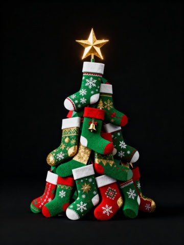 3D重拟物风圣诞袜,红绿针织纹理细腻,毛绒边与金铃铛点缀,雪景环绕,传递喜庆温馨与可爱氛围。