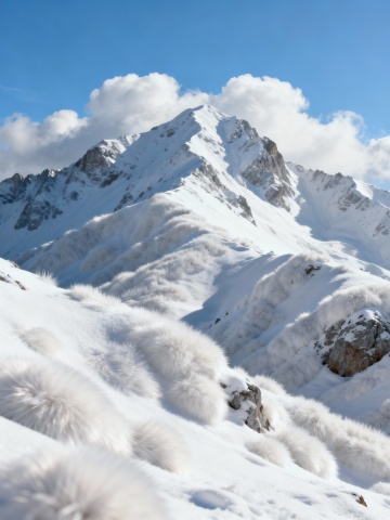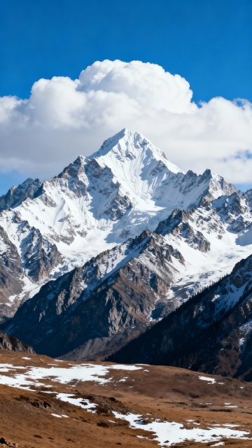 写实主义摄影风格的雪山全景,湛蓝纯净的天空中点缀着几缕形态各异的絮状白云,画面中央矗立着巍峨的雪峰,山顶覆盖着厚实的积雪,山脊线锐利清晰,阳光照射下的雪面呈现出明亮的高光与柔和的阴影过渡,山体下部为深褐色岩石,岩石纹理粗糙且层次分明,近处的山峦呈现出暖棕色与深褐色的渐变,山谷间可见部分冰川痕迹,整体光影为清晨或傍晚的侧逆光效果,营造出壮阔、宁静而神圣的氛围,增加几处山间飘动的薄雾,使画面增添一丝朦胧的神秘感。