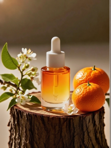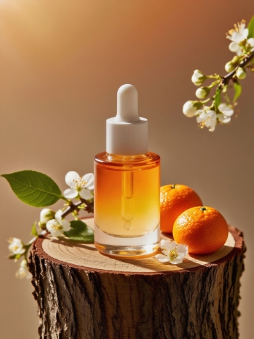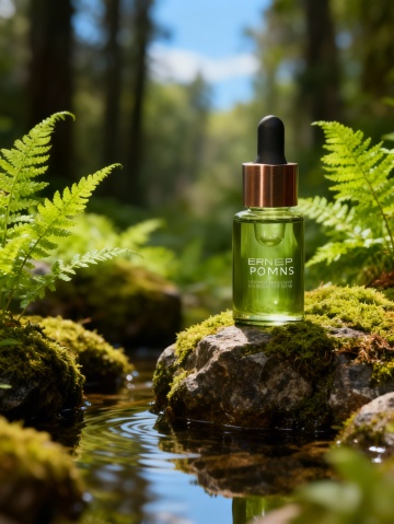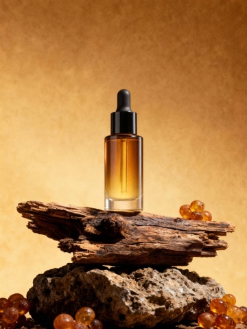 大瓶置于浅棕色长方体石质台座上,台座后方叠放一块浅棕色方形哑光块体。同色系小棕瓶,小瓶置于表面粗糙、浅棕带灰纹的鹅卵石上。周围元素:瓶身周围环绕灰绿色细长叶面、细密枝叶的迷迭香类植物,还有 3-4 颗浅棕色小坚果和小鹅卵石,散落在鹅卵石及台座周围。 场景与构图:错落层叠构图,前景(小瓶 + 鹅卵石)、中景(大瓶 + 石质台座)、背景层次分明;背景为浅棕色调;自然打光形成自然阴影,突出琥珀瓶的通透质感、石材的粗糙纹理与植物的叶片层次;色彩以暖调为主(浅米背景、棕褐瓶身、浅棕石材、灰绿植物),整体呈现自然有机的高端护肤产品展示场景