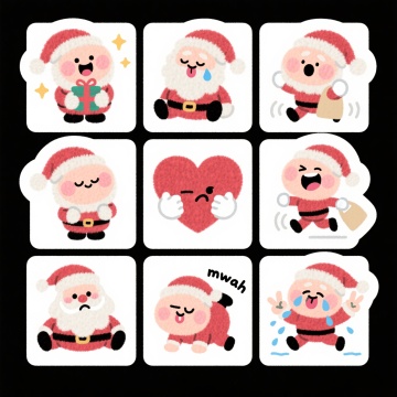 可爱卡通圣诞老人插画,扁平风格搭配毛发生长质感,表情丰富充满喜庆感,融合emoji风趣味动作,传递节日欢乐氛围。