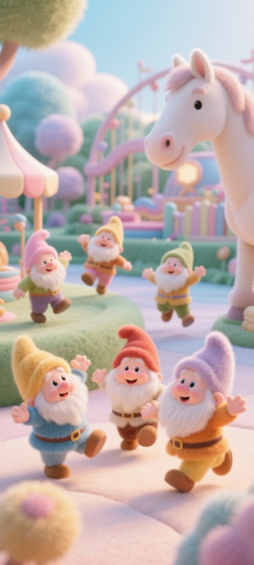 梦幻感十足的软3D卡通场景,毛发生长风与粘土质感结合,七个小矮人欢快奔跑,背景粉色童话乐园,充满可爱与节日氛围。