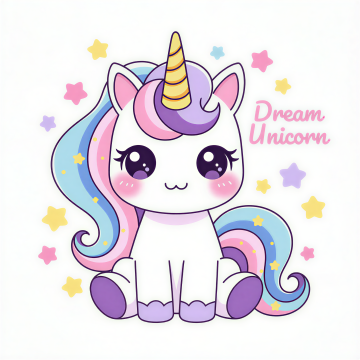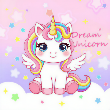 可爱感十足的拟人风小独角兽,搭配梦幻彩虹与星星爱心,采用扁平插画风格,充满童趣与节日欢乐氛围。