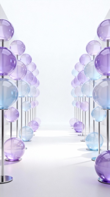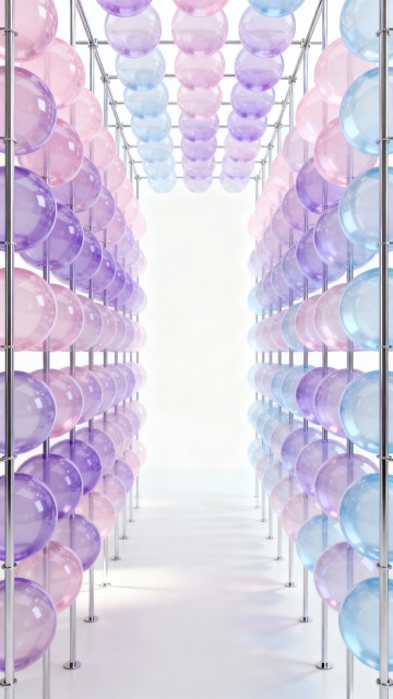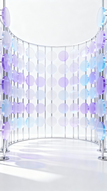 美妆直播间背景,极简未来主义风格,由大量半透明圆形装置组成的对称隧道式空间,主色调为淡紫色、浅蓝色与白色的渐变融合,柔和均匀的顶部光源照亮整个场景,营造出梦幻、通透、轻盈的氛围,装置排列呈现出强烈的纵深感和重复韵律感,地面为光滑的白色材质,反射装置的色彩与光影,整体视觉干净、现代且富有高级感,无人物,无LOGO、电话地址及二维码等信息。