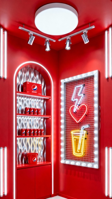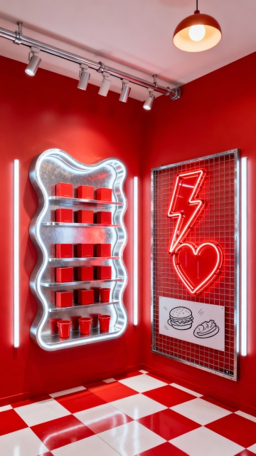 工业风潮牌服饰直播间背景,裸露红砖墙面搭配金属管道,顶部悬挂复古金属吊灯,暖黄色主光源与红色霓虹灯光交织营造氛围感。左侧墙面有彩色涂鸦卷帘门,下方放置黑色金属工具箱;中央竖立多块复古车牌组成的装饰墙;右侧为贴满潮流贴纸的锈迹金属储物柜,旁边是带涂鸦的黑色油桶。地面为水泥质感,整体色调以红、黑、金属灰为主,保留斑驳做旧质感,无任何文案及拍摄支架,视觉层次分明,充满街头潮流与工业复古的融合感。