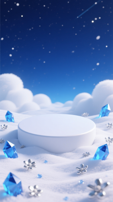 白色的圆形展示台置于柔和的白色云朵上,前景被白雪覆盖,周围分散的水晶被雪覆盖着,还有少量粉色的小花点缀其中,背景是夜空,3D卡通风格。