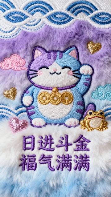 紫蓝色与白色渐变毛绒布料背景,刺绣风格,居中是一只紫白相间的卡通猫咪(头顶绣金色元宝、脸颊/胸口绣红色爱心),周围搭配中式回纹边框、金色灯笼、粉蓝渐变祥云,底部绣‘招财进宝’‘岁岁平安’蓝色文字,刺绣纹理饱满立体,温馨招财的吉祥氛围