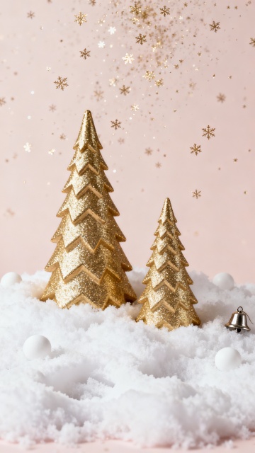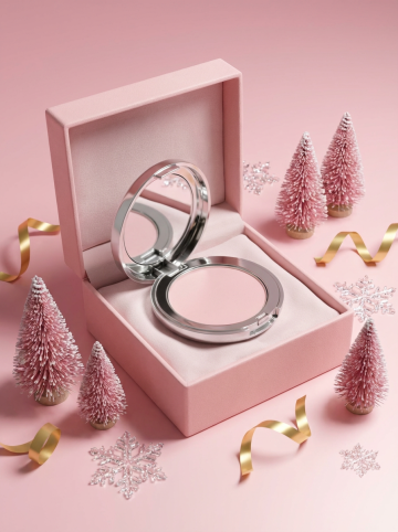 3D微缩艺术风,金属质感粉饼盒置于粉色礼盒中,搭配毛绒圣诞树与雪花,营造甜蜜温馨的节日氛围。