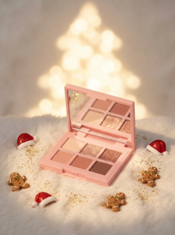 微缩艺术风圣诞主题眼影盘,柔粉配色搭配姜饼人与小红帽点缀,光影营造梦幻温馨感,粒子闪烁增添甜蜜喜庆氛围。