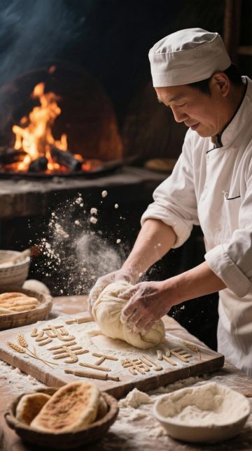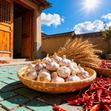 传统日式农家厨房,木质结构屋顶与地板,阳光透过木质格栅门洒入形成光柱,中央土灶上的铁锅正冒着大量白色蒸汽,周围木桌上摆满竹篮盛装的新鲜蔬菜与食材,墙上挂着传统装饰画,竹编容器与陶罐点缀其间,整体氛围温暖质朴充满生活气息,光影层次丰富,细节质感真实,色调以原木色与自然光影为主,营造出宁静而富有烟火气的烹饪场景。
