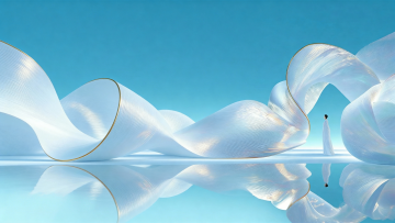 极简主义风格3D渲染海报,画面主体为流畅飘逸的波浪形曲面,表面覆盖细腻的网格纹理,柔和的漫反射光源从画面右侧上方照射,形成自然的光影过渡和轻微的高光反射,整体色调采用低饱和度的渐变配色,从浅灰蓝过渡到淡紫粉色,曲面底部带有细密的横向线条纹理增强质感,背景为纯净的渐变白色,营造出宁静、科技感与优雅并存的氛围,整体构图遵循三分法原则,视觉焦点集中在波浪曲线的交汇点,设计简洁现代,信息传达高效,符合高端科技产品或艺术展览的宣传需求,具有强烈的视觉冲击力和现代设计感。