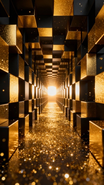 黑金背景,深邃黑色为底,金色几何元素构成复杂立体空间,多组大小不一的金色长方体块以不规则角度交错排列,形成纵深感极强的隧道式构图,中央底部有明亮的金色光源向上发散光芒,光线照亮周围的金色方块边缘,无数金色细小光点如星尘般散布于黑色背景和方块间隙中,整体呈现出奢华、科技感与未来感兼具的氛围,光影对比强烈,金色部分具有金属光泽和反光质感,黑色部分深邃沉稳,营造出高端大气的视觉效果。