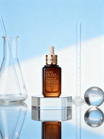 清透玻璃球内悬浮科技感瓶身,微缩艺术构图,3D渲染极简主义设计,未来感雪景背景,冰蓝基座呼应纯净主题。