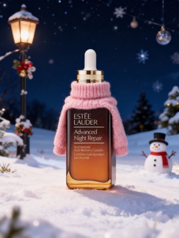 梦幻雪夜中,修护精华披上粉色毛衣,拟人化设计融合温馨与甜美,轻拟物风营造节日氛围,面料质感与毛发生长细节呼应冬日温暖。