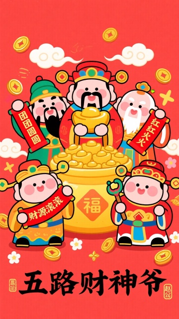 国潮风插画,卡通财神手持“招财进宝”卷轴,金元宝与红包环绕,轻拟物剪纸元素点缀,喜庆祥云衬托,春节氛围浓厚。#发财壁纸