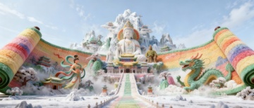 梦幻感与国潮风交融,中式古塔以毛发生长风呈现彩虹色,重拟物与浮雕设计凸显喜庆卡通感,传统建筑焕发奇幻新貌。