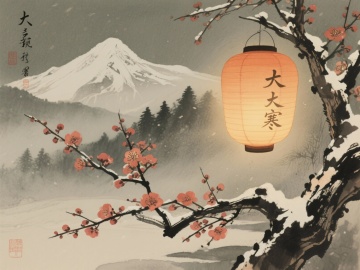 水墨风与浮世绘交融,雪中梅枝映衬富士山,暖色灯笼悬于枝头,写意“大寒”节气,静谧唯美的东方诗意。