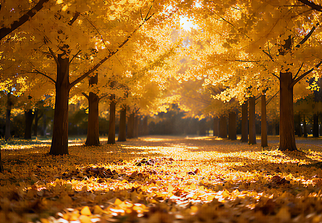 一条被金色银杏叶覆盖的蜿蜒小路,两侧是高大的树木,枝头挂满金黄的叶子,阳光透过树叶洒下斑驳的光影,地面铺满落叶,营造出温暖而宁静的秋日氛围,道路尽头隐约可见远方的景色,整体画面色彩浓郁,光影层次丰富,呈现出写实的摄影风格,具有强烈的视觉冲击力和自然美感。详情