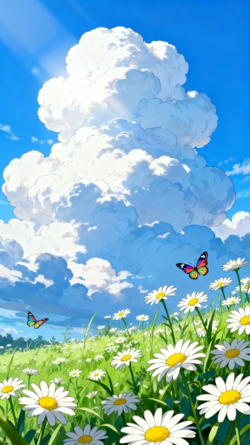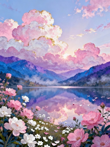 超高清动漫风格插画,广阔无垠的蔚蓝天空中漂浮着巨大蓬松的白色积云,云层边缘泛着柔和的白光,天空呈现出由浅至深的渐变蓝色调。下方是波光粼粼的蓝色海洋,海面上有白色的浪花和粉色、橙色的光斑闪烁,仿佛阳光洒在水面上的效果。画面中央偏左位置,云层与海面交界处有一团明亮的白色光芒爆发开来,伴有蓝色和粉色的粒子向四周飞溅,整体画面充满了梦幻、清新、治愈的氛围,色彩明快鲜亮,光影对比强烈,笔触细腻柔和,具有强烈的视觉冲击力和艺术美感。