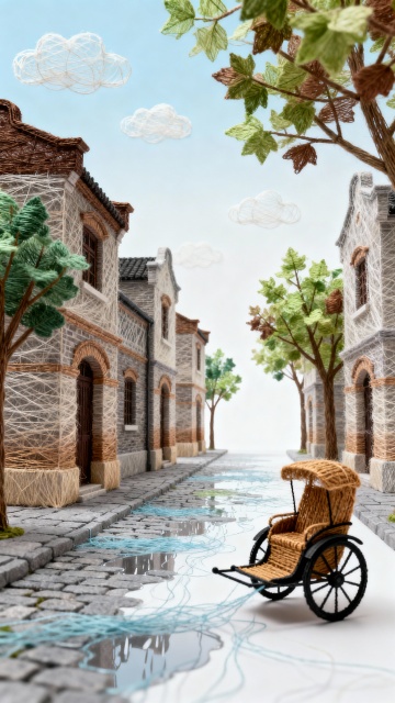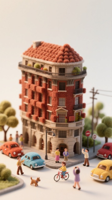 毛线编织的冬日小镇,融汇刺绣风与微缩艺术,卡通人物在雪中嬉戏,暖灯映照出温馨梦幻的圣诞氛围。