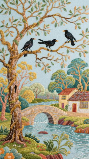 梦幻插画风,微缩艺术展现刺绣场景,清新可爱,仿佛童话中的手工节日。