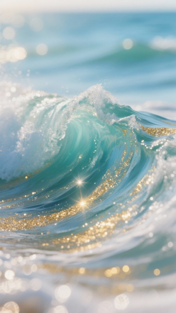 夏日氛围下的果冻啫喱质地海浪,清澈透明的蓝绿色调,阳光照射下呈现出晶莹剔透的光泽感,海浪边缘泛起细腻的白色浪花,浪花造型改为层层叠叠的扇形卷曲样式,整体画面充满清凉通透的夏日气息,光影效果自然柔和,水波纹理清晰可见,营造出宁静而梦幻的海洋景象。