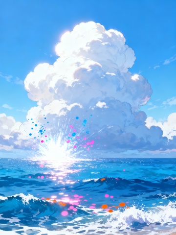 动漫风格插画,广阔无垠的蓝色海洋占据画面下方三分之二,海面波光粼粼,泛着细碎的白色浪花和银色反光,呈现出深浅不一的蓝绿色渐变,海天交界处是明亮的水平线,上方是纯净的浅蓝色天空,漂浮着几朵形态饱满、边缘柔和的白色积云,整体画面宁静、开阔、明亮,充满治愈感,阳光从云层间隙洒落,在海面形成长长的金色光带,营造出温暖而祥和的氛围。