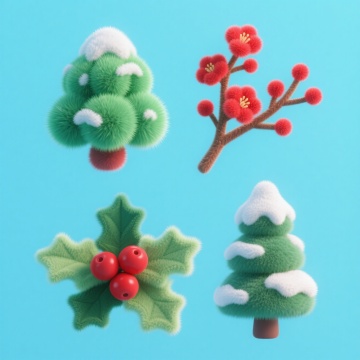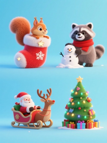 六个具有3D立体风格的圣诞元素集合,每个元素采用完全不同的材质,造型统一,规整排布在纯色背景上。元素包括:顶部带金色星星、挂有彩色球和拐杖糖的圣诞树;戴着绿色围巾、怀抱心形礼物、有棕色鹿角和红色脸颊的驯鹿;装满礼物、顶部有姜饼人、装饰有冬青叶和红色浆果的红色圣诞袜;系有金色铃铛和冬青叶的红白条纹拐杖糖;棱角分明、线条清晰的白色雪花;戴着红色圣诞帽和条纹围巾、有胡萝卜鼻子和红色手套的雪人。材质分别为:光滑塑料质感的圣诞树,哑光陶瓷质感的驯鹿,毛绒布料质感的圣诞袜,金属光泽质感的拐杖糖,透明水晶质感的雪花,柔软针织质感的雪人。整体色彩鲜艳明快,保持原图的圣诞氛围和元素特征,光影效果柔和,立体感强,各元素间距均匀,构图平衡。