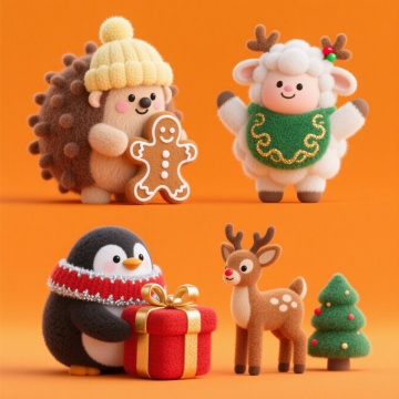 软3D风圣诞场景,拟人化兔子与姜饼人萌趣互动,毛发生长质感搭配粘土风小屋,营造温馨喜庆的节日氛围。