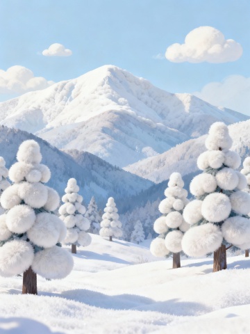 梦幻冬日故宫,软3D毛绒云朵与拟人雪球萌趣互动,晶莹雪花与粒子光效交织,卡通感十足的虚拟自然场景,充满可爱与童话气息。